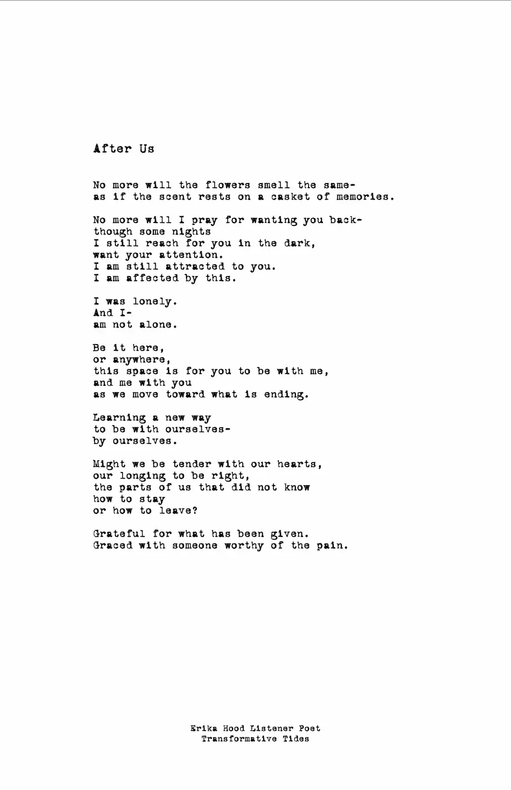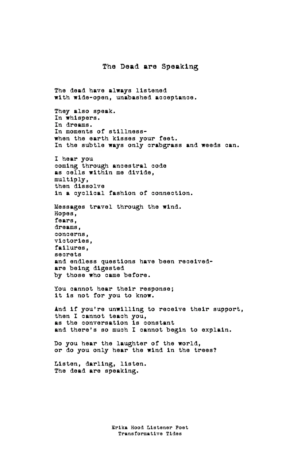 This practice is informed by my training with The Good Listening Project’s Listener Poet program and offered independently.
